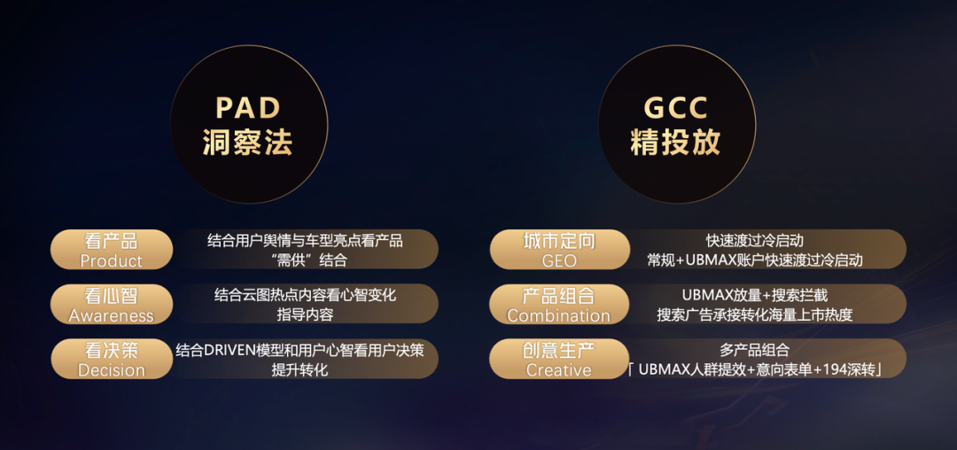 针对痛点,省广团队构建 “PAD 洞察(Product-Awareness-Decision)+GCC 投放(Geo-Combination-Creative)” 双体系,通过贯穿投前洞察、投放执行与效果复盘的全链路打法,助力岚图梦想家实现线索量与销量双突破。