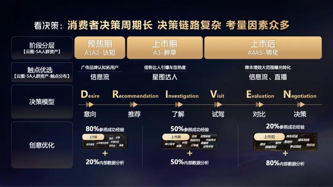 最后,省广团队运用集团自研的“DRIVEN模型”,对用户从认知到转化进行分层,并制定差异化沟通策略。例如预热期通过信息流扩大认知,上市期借助星图达人深度种草,后期则通过直播与信息流组合促成转化,有效推动用户完成决策全流程。