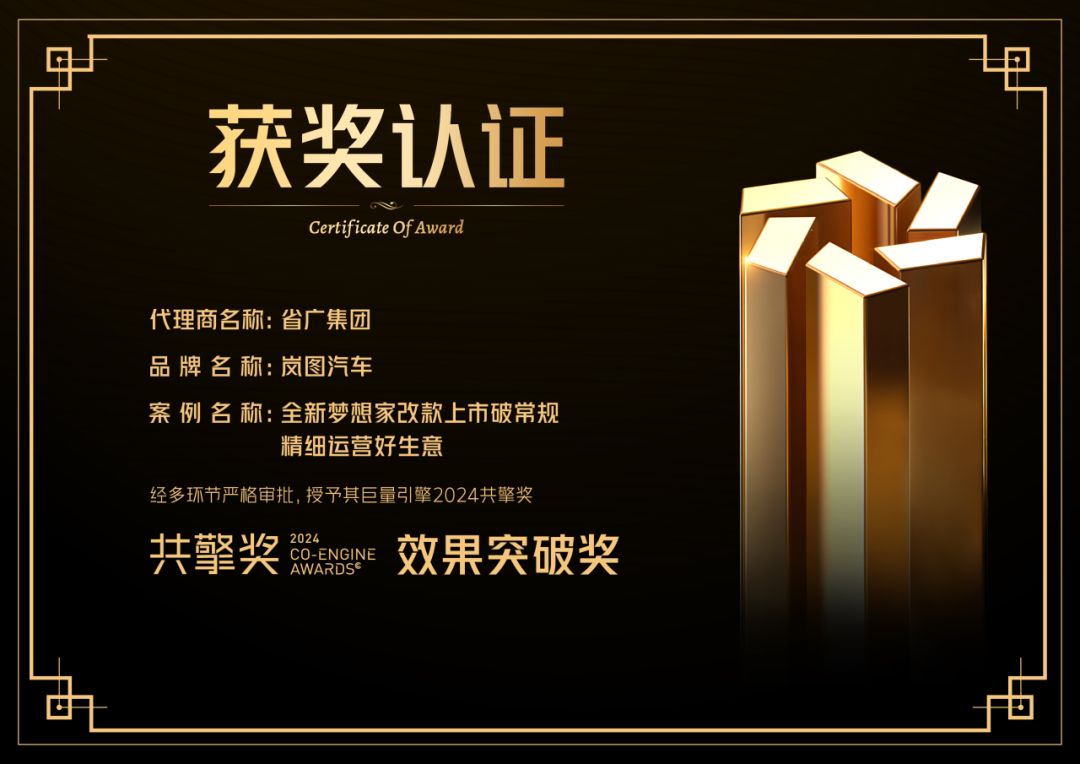在效果营销不断演进的今天,省广集团(002400)以深厚的行业洞察与体系化方法论,持续助力品牌破解增长难题。今年4月,凭借在汽车营销领域的创新实践与显著成效,省广集团于2025巨量引擎“共擎奖”评选中斩获两项「效果突破奖」。
