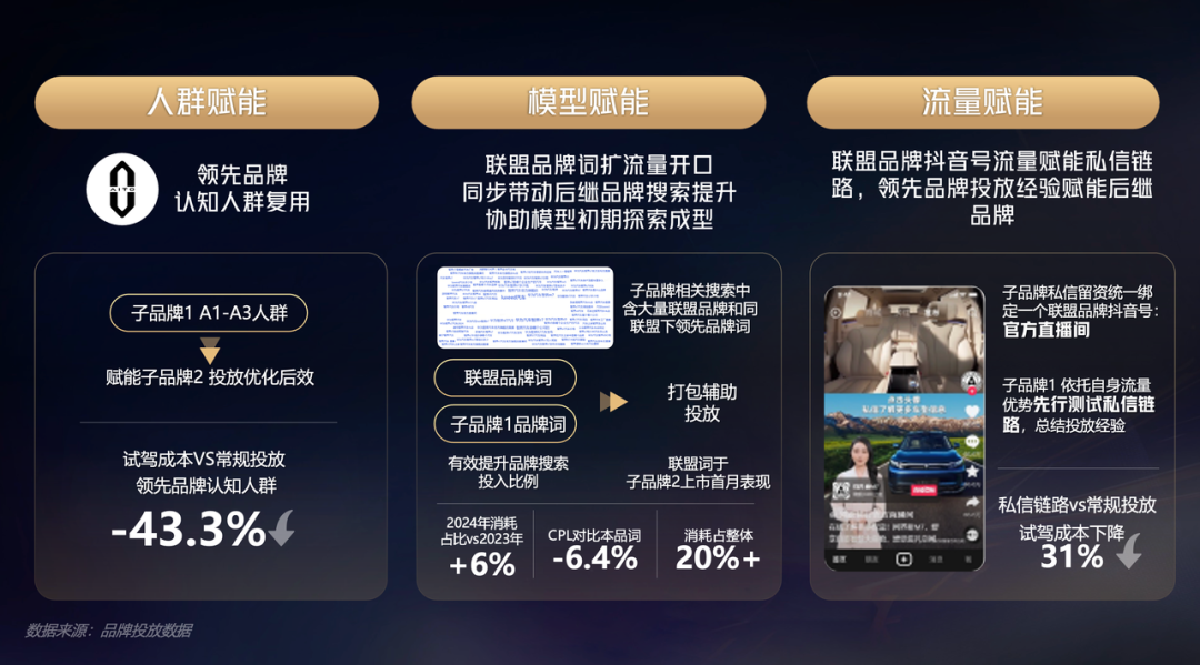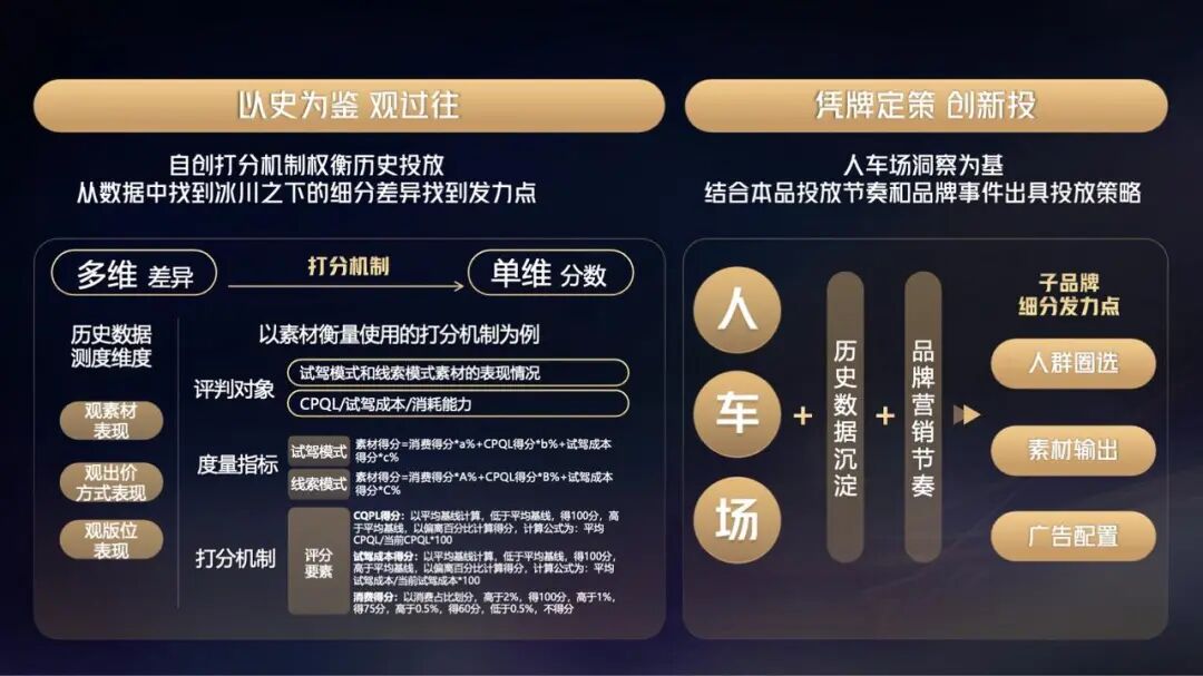 首先是人群赋能,将旗舰车型已积累的人群包复用给新车进行投放,有效撬动成熟品牌的用户认知基础,帮助新车型提升投放效率。