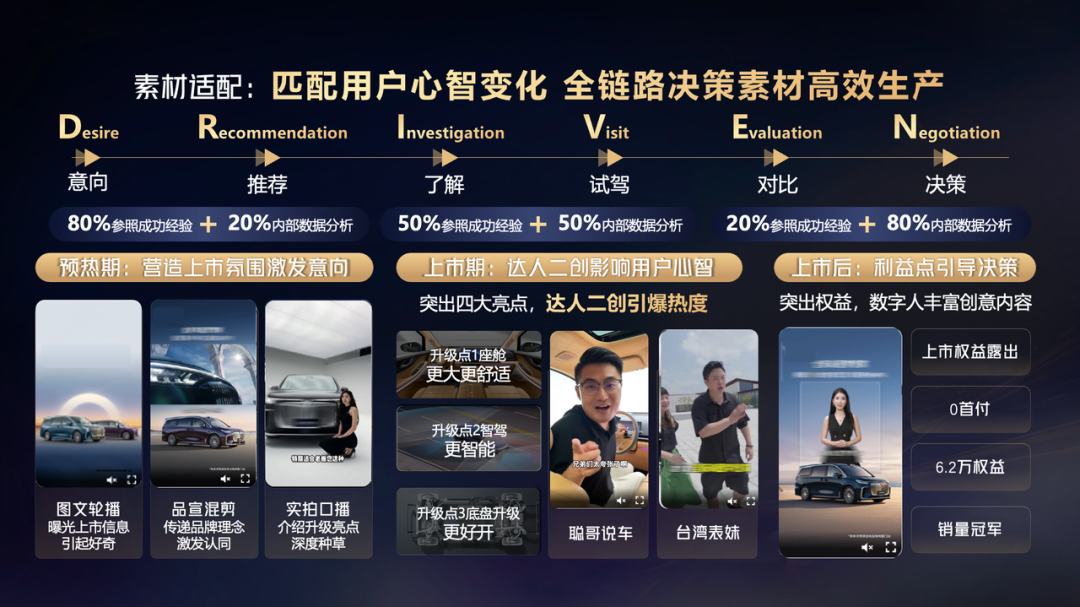 最后的流量赋能则体现在链路创新上,让旗舰车先行测试私信链路,待模式跑通后复用于新车,整体提升了后链路的转化效率,通过数据化的方式真正实现品牌和产品间的资源互哺。