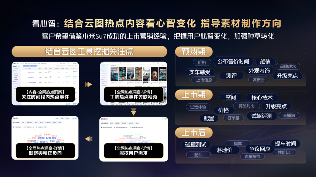 其次,借助巨量云图进行心智追踪,团队发现用户关注点随上市节奏明显变化:预热期聚焦品牌理念与价格猜测,上市期转向空间体验与核心技术,后期更关注购车权益与性价比。这一洞察为内容节奏规划提供了明确指引,实现分阶段精准沟通。