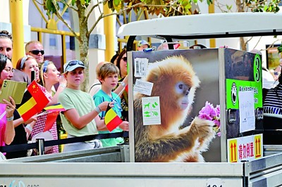 5月14日,在比利时布吕热莱特,人们欢迎来自中国的三只金丝猴抵达天堂动物园。新华社发